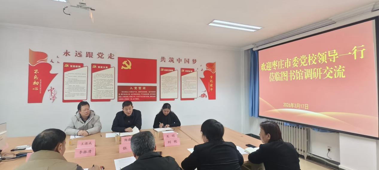 3月17日下午,枣庄市委党校校(院)务委员会委员、市社会主义学院专职副院长陶建琦一行3人到图书馆调研交流,会议由图书馆馆长张伟主持,图书馆领导班子成员、部室主任代表参加活动。